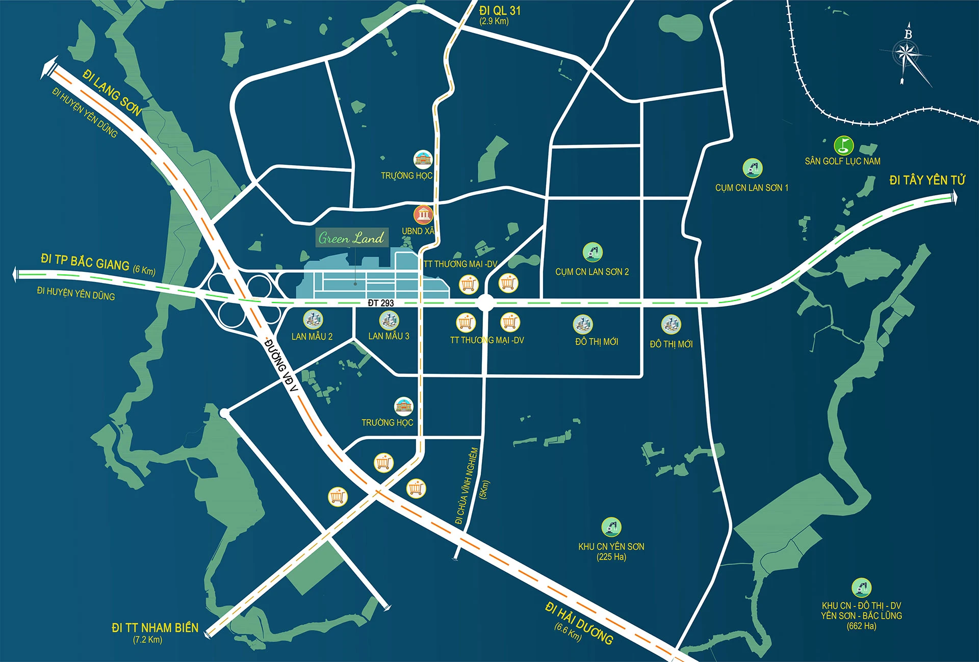 KIẾN TẠO GIÁ TRỊ VỮNG BỀNDự án có vị trí vô cùng đắc địa có lợi thế là cửa ngõ phía Tây Nam của huyện Lục Nam. Cách Trung tâm hành chính huyện Lục Nam 12,7 km, cách Thành phố Bắc Giang khoảng 6 km theo trục đường Tâm Linh Tỉnh lộ 293 và Quốc lộ 31. Cùng với đó Đường tỉnh lộ 293 còn là trục chính hướng đi Tây Yên Tử là một trong những Quần thể di tích được tổ chức Giáo Dục, Khoa Học và Văn Hóa Liên Hợp Quốc UNESCO công nhận là di sản thiên nhiên của thế giới.
